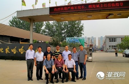 圖為6月5日,中國農(nóng)業(yè)大學(xué)水利與土木工程學(xué)院嚴海軍院長、國家半干旱中心節(jié)水部主任檀海斌、副主任張愛習、灌溉網(wǎng)總經(jīng)理劉洋受農(nóng)哈哈集團公司田園分公司張學(xué)謙經(jīng)理邀請到訪河北農(nóng)哈哈機械集團合影照片。